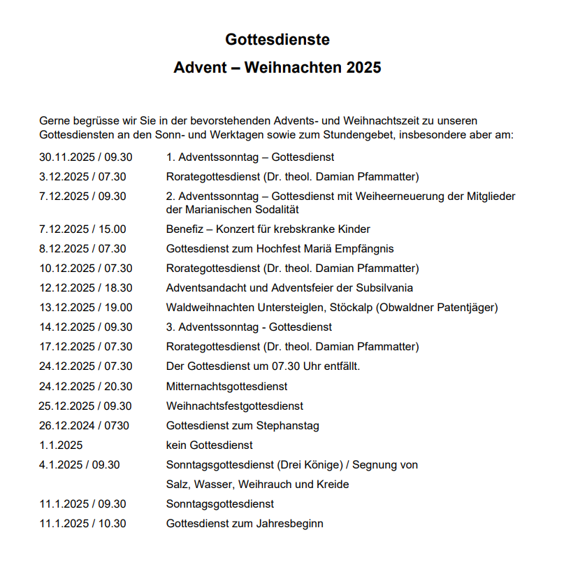 18.30 Adventsandacht in der Kollegikirche (P. Benedikt Staubli)